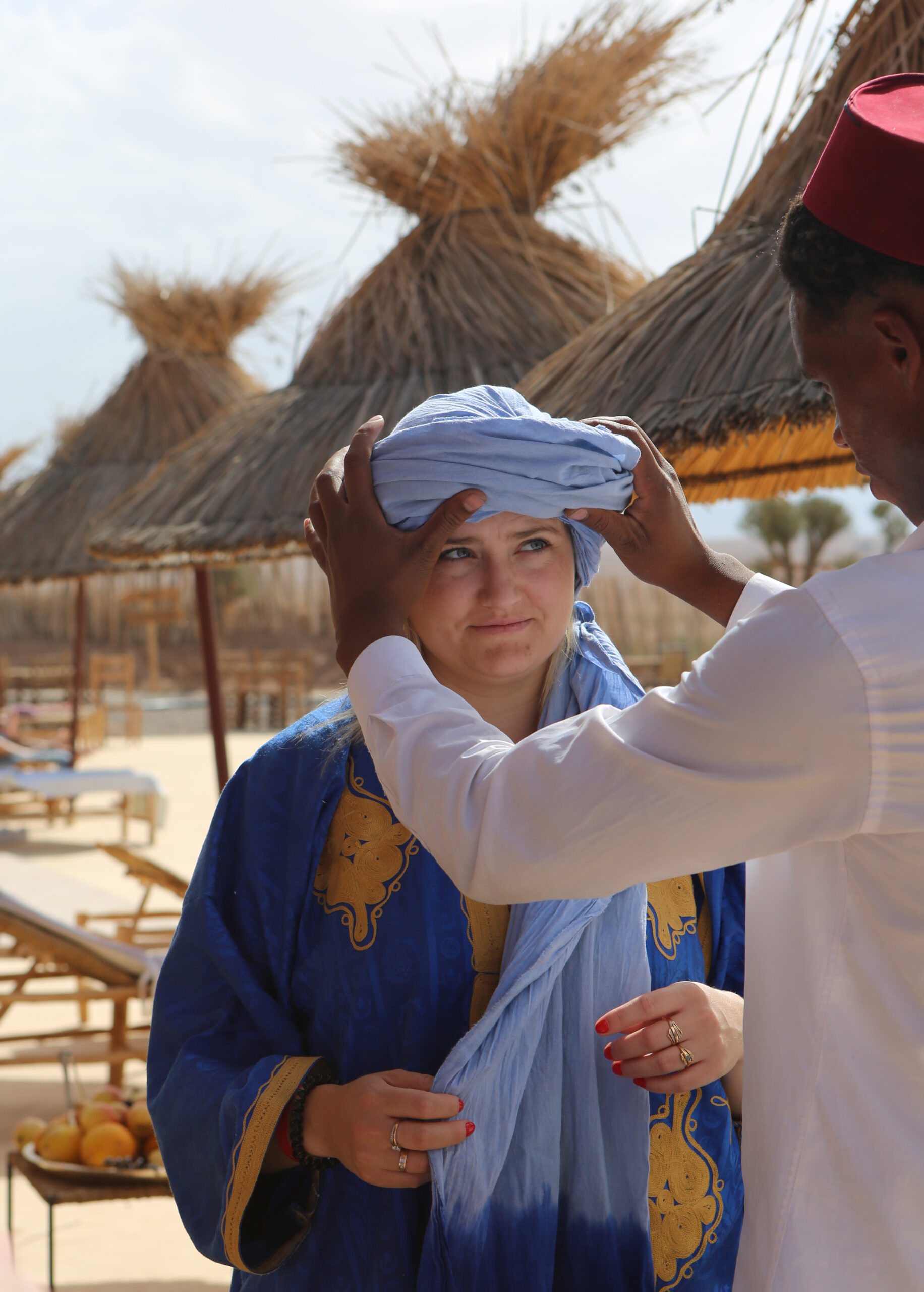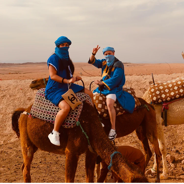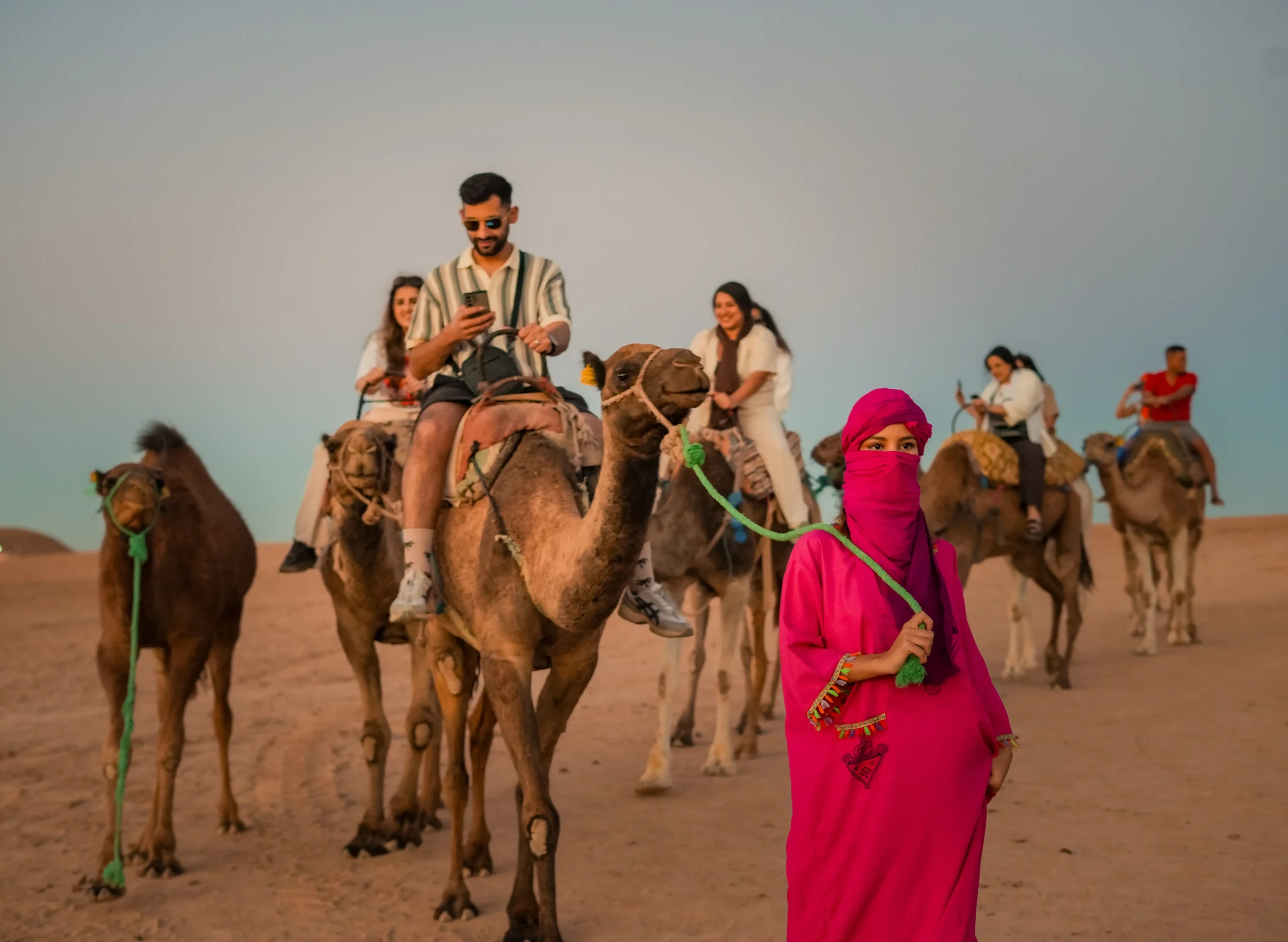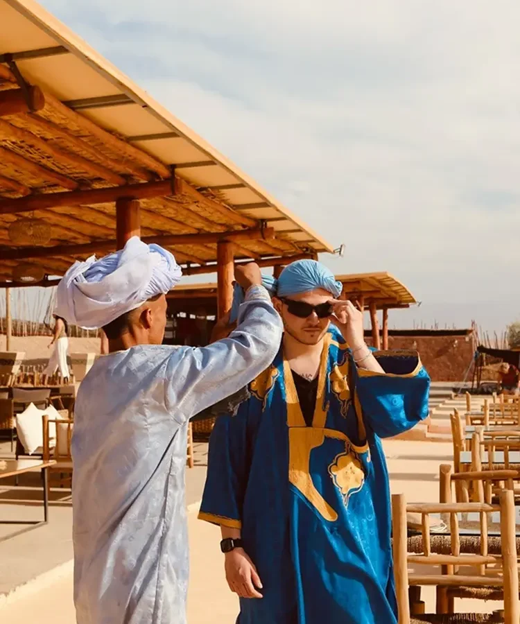 Después del quad, vivirás una experiencia más tradicional con un paseo en camello al estilo nómada. Vestido con un pañuelo sahariano, recorrerás el desierto mientras el sol comienza a ponerse, creando un espectáculo de colores dorados y rojizos.