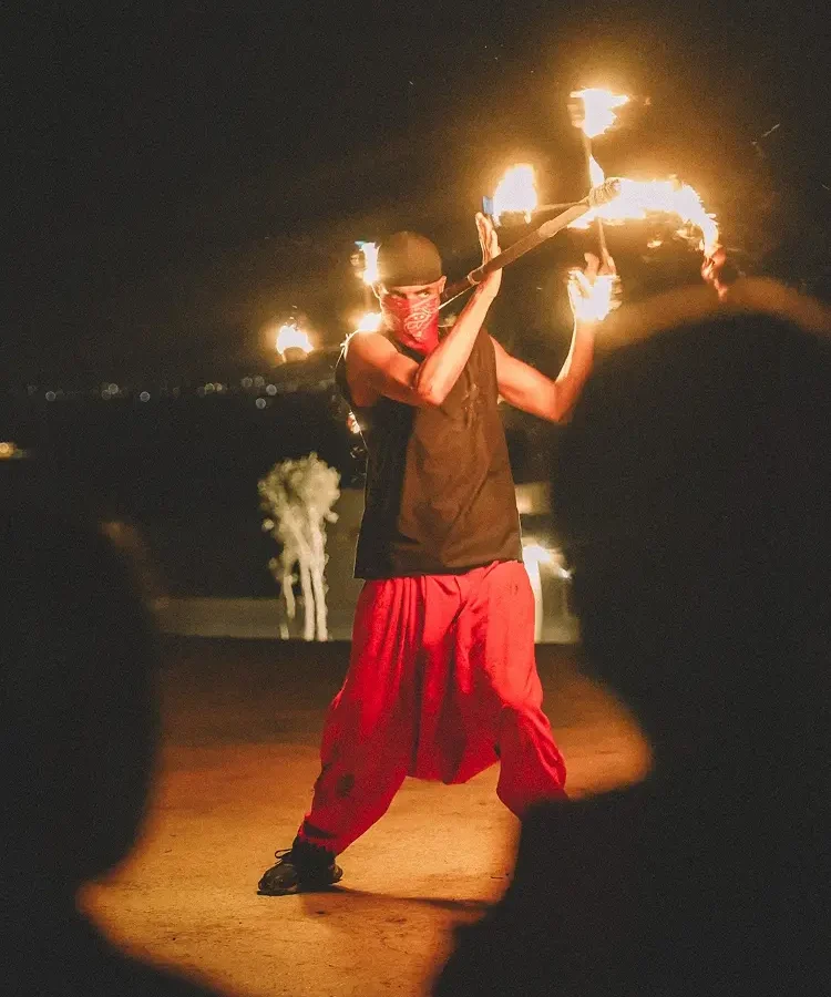 La experiencia continúa con una deliciosa cena marroquí de tres platos, servida bajo las estrellas en un ambiente mágico. Durante la cena, disfrutarás de espectáculos en vivo que incluyen música tradicional, danza del vientre y show de fuego, creando una noche inolvidable.