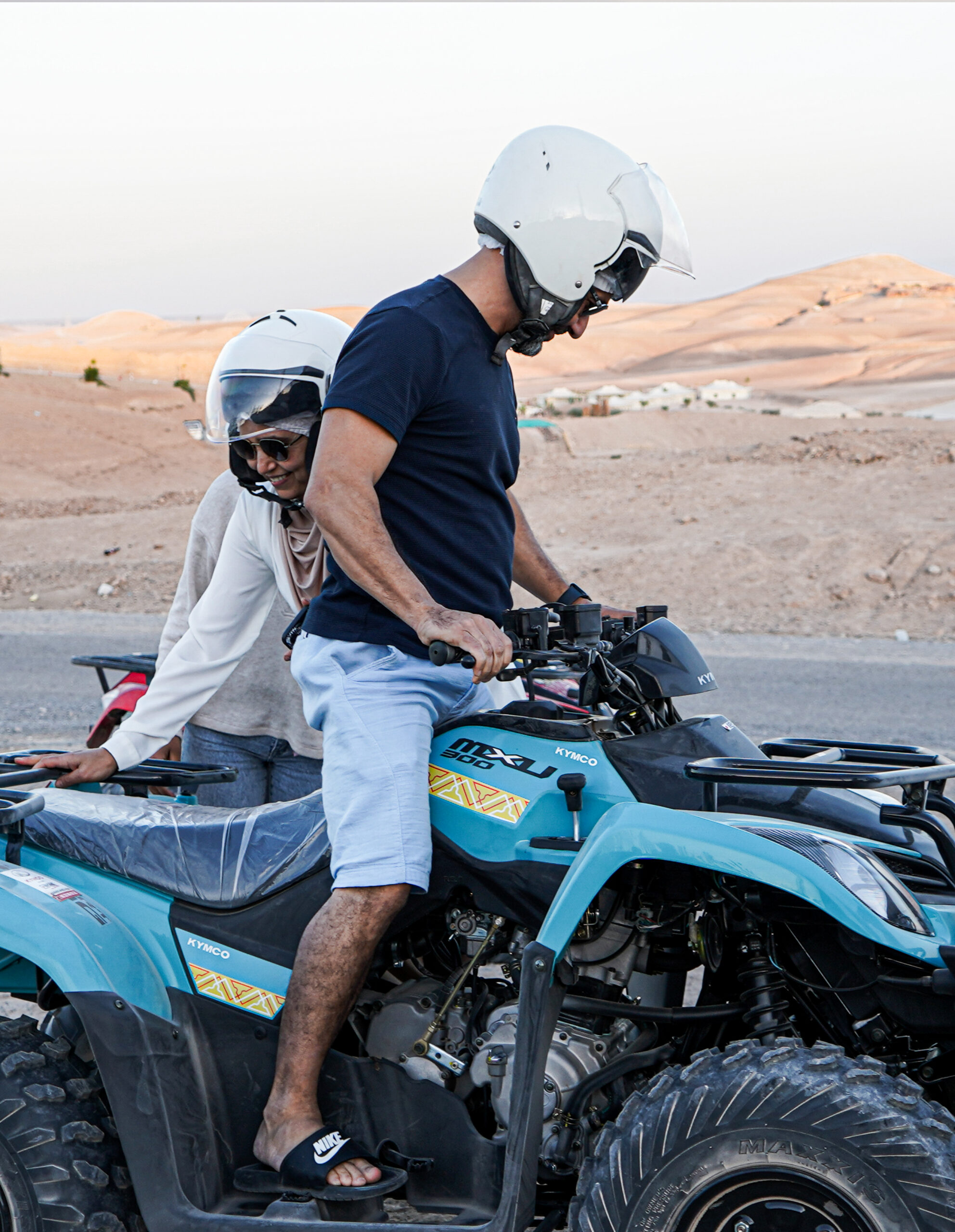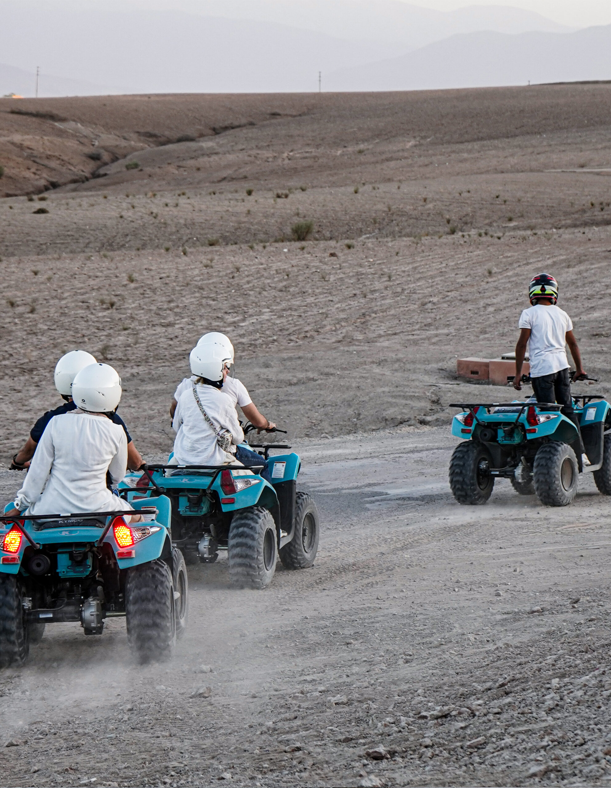 Inicio de una emocionante experiencia en quad a través de los caminos del desierto de Agafay. Tras una breve explicación de seguridad y el uso del equipo (casco y gafas), recorrerás paisajes impresionantes, disfrutando de la adrenalina y la libertad del desierto.